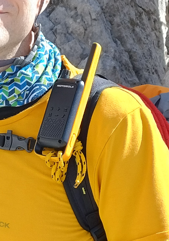 - Pokud to jde (u našich vysílaček výborně), je dobré si vysílačku přidělat 2x. Typicky sponou na popruh batohu, ale pak ještě dozajistit např. prusíkem provázaným pevným okem na vysílačce. Občas se totiž může stát, že člověk vysílačku omylem shodí z batohu a vysílačka, která se právě řítí dolů ze skály, nepotěší ani (bývalého) majitele nahoře, ani nikoho pod ním 🙂